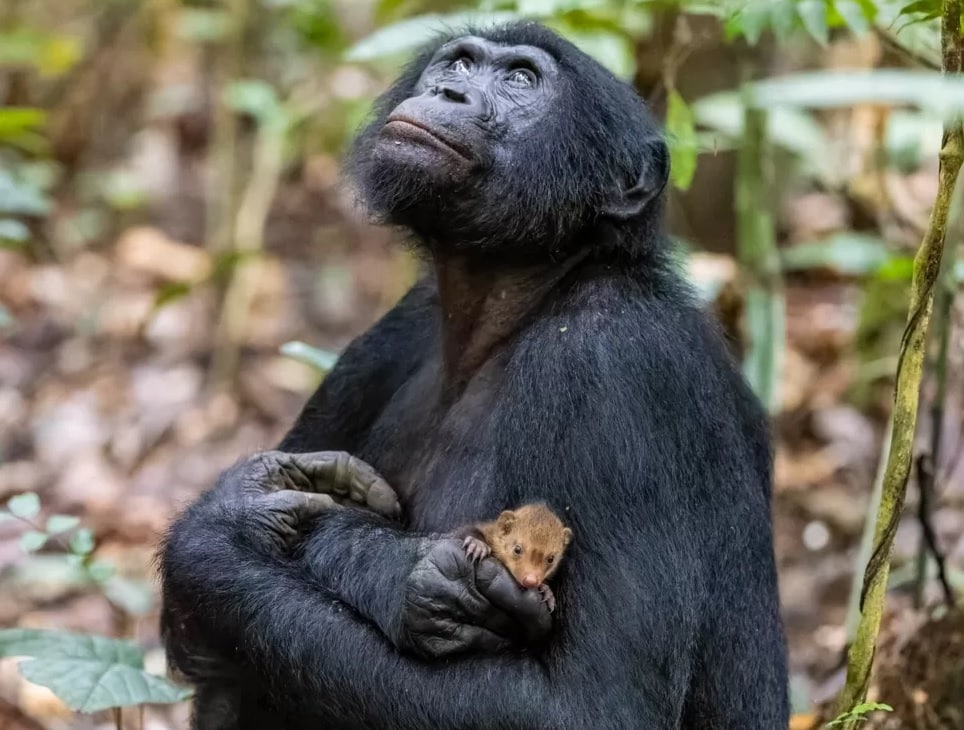 The mystery behind the picture is whether this bonobo is really showing his love for the little animal by cuddling it or is planning to kill the mongoose pup for dinner after killing its mother.